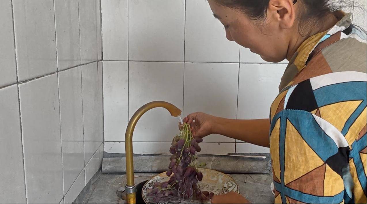 古丽扎热木·莫尼亚孜正在用厨房里的自来水清洗葡萄。人民网记者 焦磊摄