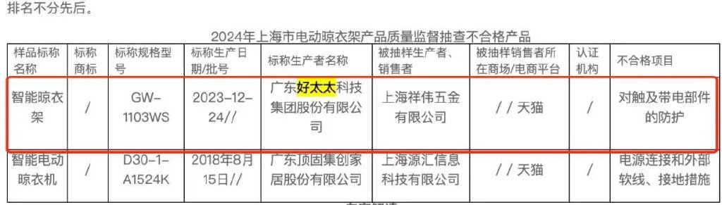 同年,上海市市场监管局通报2批次抽检不合格电动晾衣架产品,其中就包含好太太所生产的GW-1103WS电动晾衣架,不合格项目为对触及带电部件的防护。据悉,不符合标准要求,会存在使用者触电的安全风险。