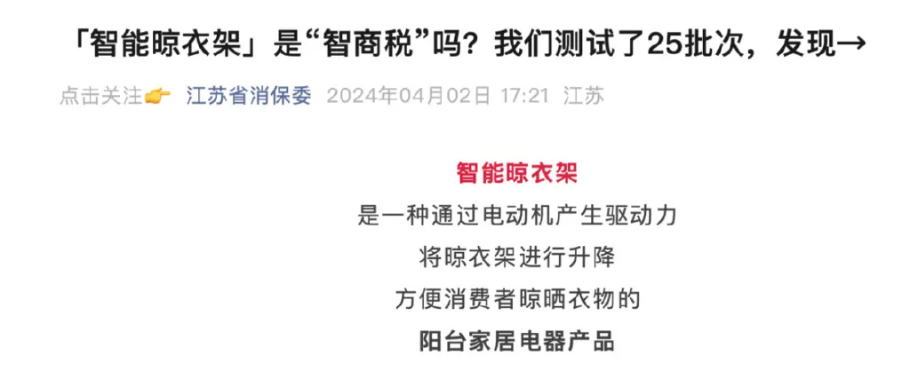 2024年4月,江苏省消费者权益保护委员会发布智能晾衣架产品的比较试验结果。好太太旗下的一款电动晾衣架在“过载项目”上不符合国家标准。国家标准规定,电动晾衣架在承受1.2倍额定负载时,应自动停止工作且无损坏,以保障使用安全。好太太涉事产品在过载测试中未触发保护机制,即未停止运行,存在安全隐患。